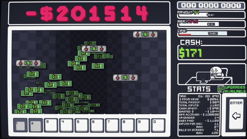В основе игры Key Your Debt простая задача: закрыть долг, используя только цифровой блок клавиатуры. Каждый запуск сводится к постоянному набору чисел, управлению доходом и борьбе с растущими штрафами. Давление идет через саму систему: долг висит постоянно, проценты продолжают капать, ошибка в темпе сразу бьет по общему прогрессу.
