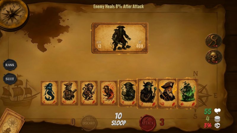 Описание игры: The Drowned Deal погружает вас в суровую атмосферу пиратских морских баталий, где успех зависит не от удачи, а от холодного расчета и стратегического мышления. Каждое плавание представляет собой уникальное испытание с процедурно генерируемыми событиями и противниками. Ввиду этого, ни одно прохождение не будет похоже на предыдущее, что заставляет постоянно искать новые тактические решения. Вам предстоит стать капитаном, ведущим свой корабль через череду опасных схваток в открытом море, где каждая ошибка может стать последней. Основой боевой системы служит формирование комбинаций, концептуально заимствованных из покера. Ваша главная задача - собирать мощные карточные руки, чтобы наносить сокрушительный урон вражеским судам. В целях достижения победы, вы будете постоянно совершенствовать свою колоду, добавляя в неё новые карты и избавляясь от слабых. Эффективность ваших действий напрямую зависит от умения выстраивать длинные и сложные цепочки карт. Грамотное построение колоды становится ключом к доминированию в морских сражениях. Просто собирать сильные карты недостаточно для выживания в суровых водах. Глубину игровому процессу добавляет система Проклятых Монет - особых артефактов, способных кардинально изменить ход боя. Обладая уникальными свойствами, эти монеты усиливают ваши комбинации и открывают скрытые синергии между картами. В ответ на ваше усиление, игра регулярно подбрасывает испытания в виде системы штрафов. Вершиной мастерства считается сбор легендарной комбинации "Утонувшая Сделка", наносящей колоссальный урон.