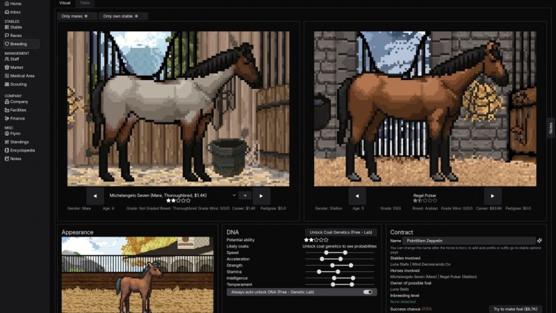 Постепенно открывается работа с наследственностью: анализ характеристик, подбор пар, выстраивание родословных. Система условной ДНК делает каждую лошадь неповторимой, а решения игрока напрямую влияют на качество будущих поколений.